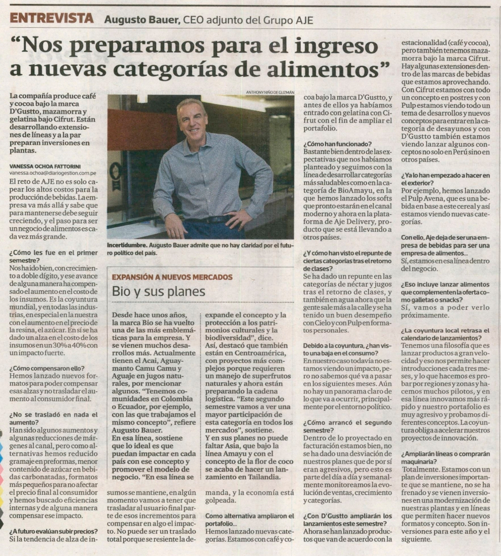 El reto de AJE no es solo capear los altos costos para la producción de bebidas. La empresa va más allá y sabe que para mantenerse debe seguir creciendo, y el paso para ser un negocio de alimentos es cada vez más grande. Conversamos con Augusto Bauer, CEO adjunto del Grupo AJE.